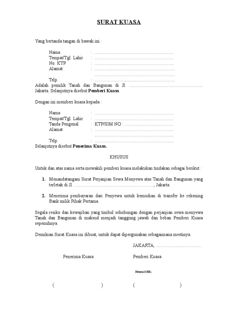 Surat kuasa adalah dokumen yang digunakan untuk memberi pernyataan perwakilan pada seseorang. Simak pengertian, cara membuat dan contohnya . Oleh karena itu, dalam memberikan kuasa khusus melalui surat anda selaku pemberi kuasa wajib memperhatikan kuasa apa yang akan anda berikan. Pemberi kuasa senantiasa dianggap telah memberi kuasa kepada penerima kuasanya untuk menunjuk seorang lain sebagai penggantinya untuk mengurus .